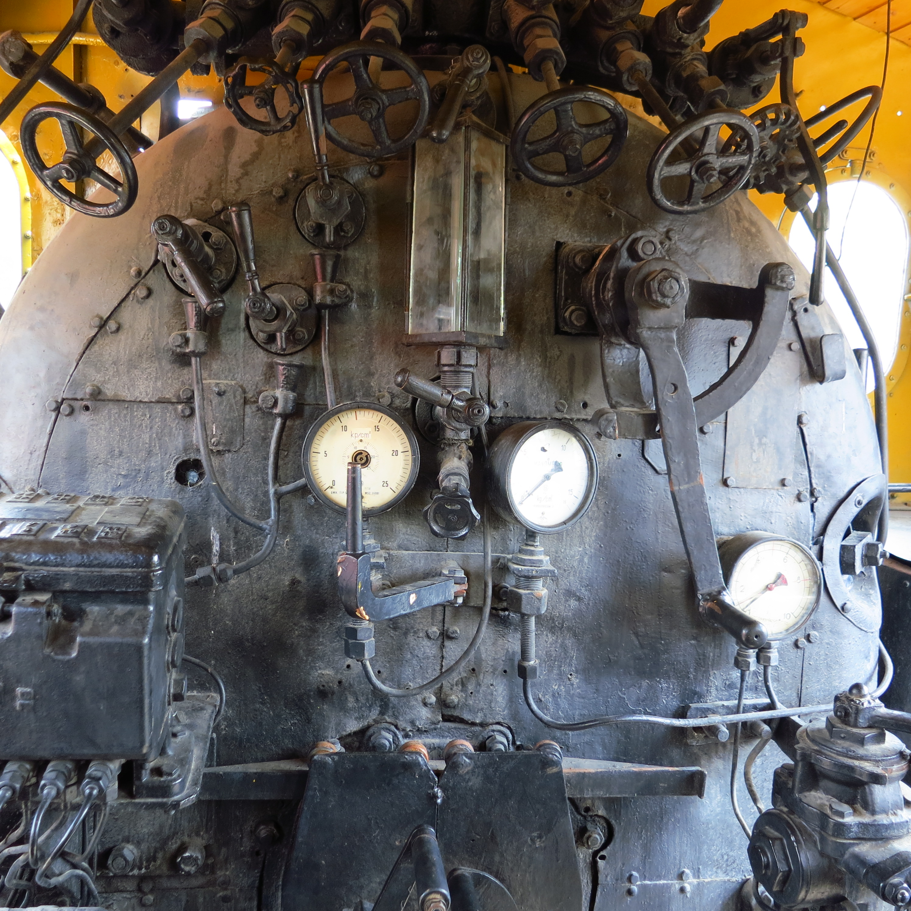 Two of many historical steam locomotivesAll the wheels and gauges inside a locomotive