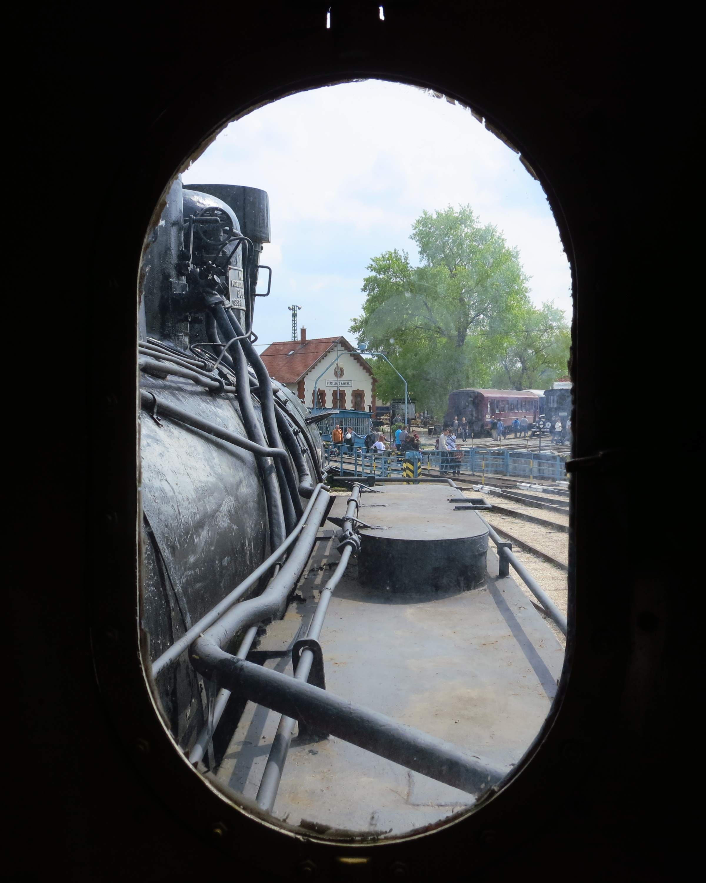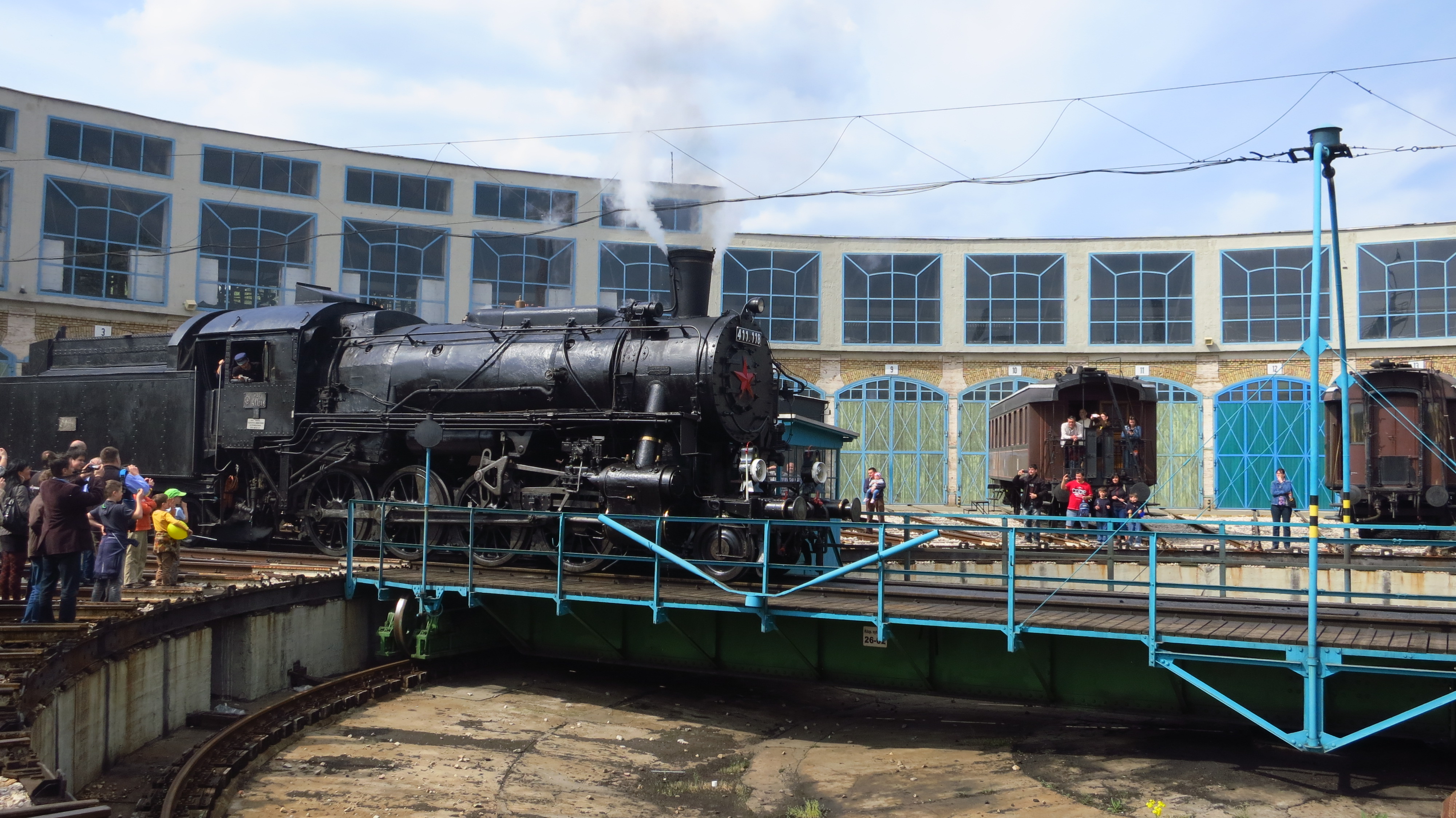 A historical MAV diesel engine is driving on the roundableAfter the diesel engine was set into its new space, the steam locomotive was let out via the roundableOther exhibits in the workshop (see the oldtimer car)